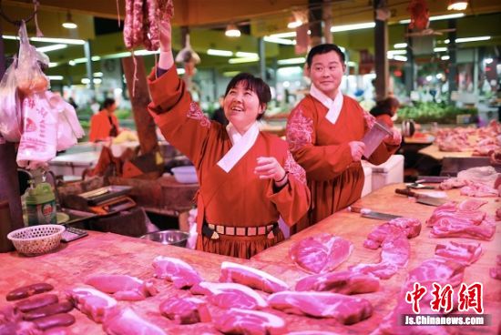 4月14日身着帅气飞鱼服的“锦衣卫”在剁肉卖卤菜,穿着窄袖红黑刺绣竹纹短打的“夫妻档”在麻利卖菜,着一袭柔美齐腰襦裙的翩翩女子在贩卖水果……位于南京城北的金盛迈皋桥老街菜场13日上演了一场卖菜版的“汉服秀”,让前来买菜市民感到新鲜有趣。
